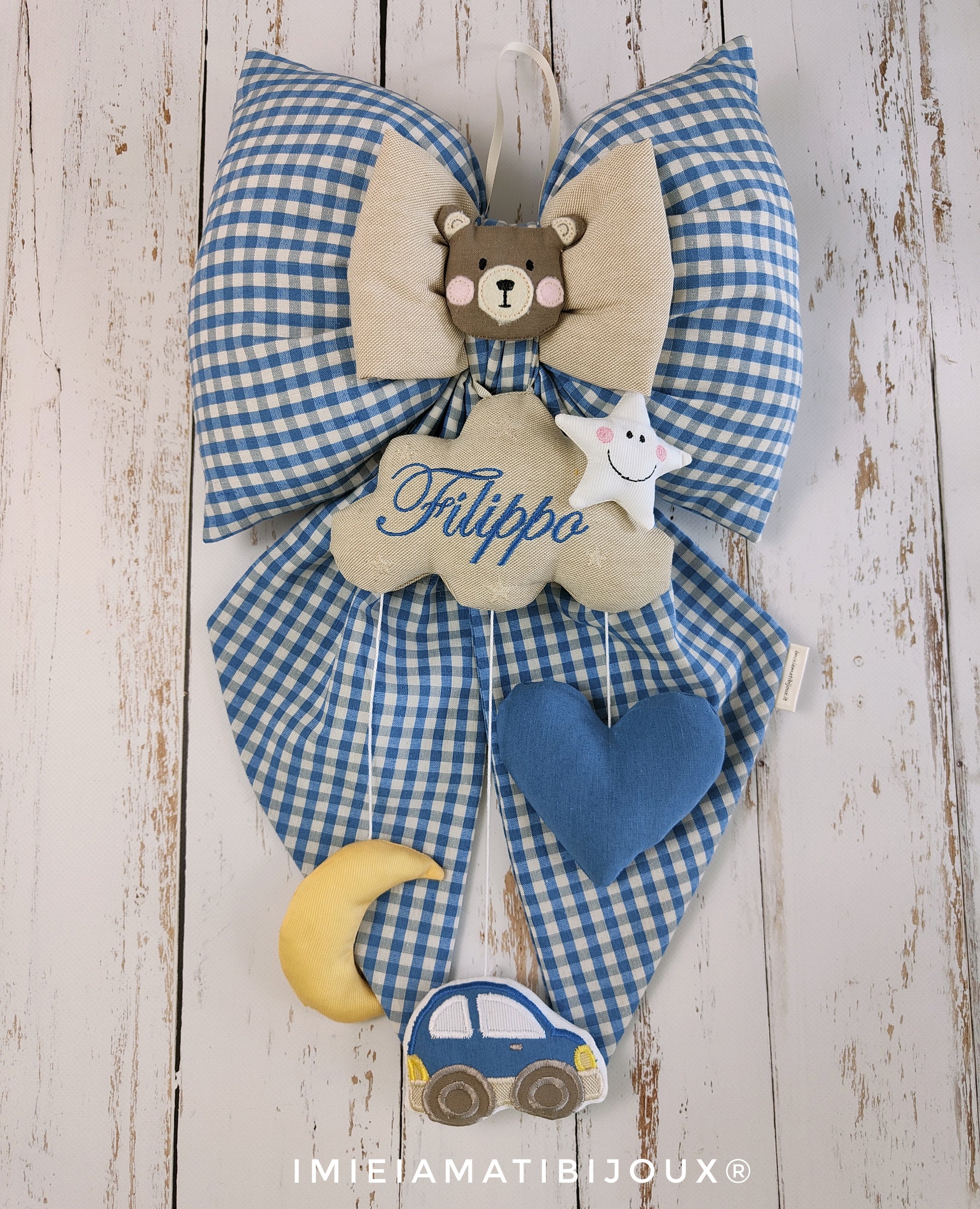 Fiocco nascita imbottito con orsetto, nuvola e stelline. Cucito e ricamato artigianalmente. Dimensioni 30×50cm. Per qualsiasi richiesta e personalizzazione potete mandarmi un messaggio qui prima e dopo l'acquisto. Oppure per mail a imieiamatibijoux@virgilio.it.