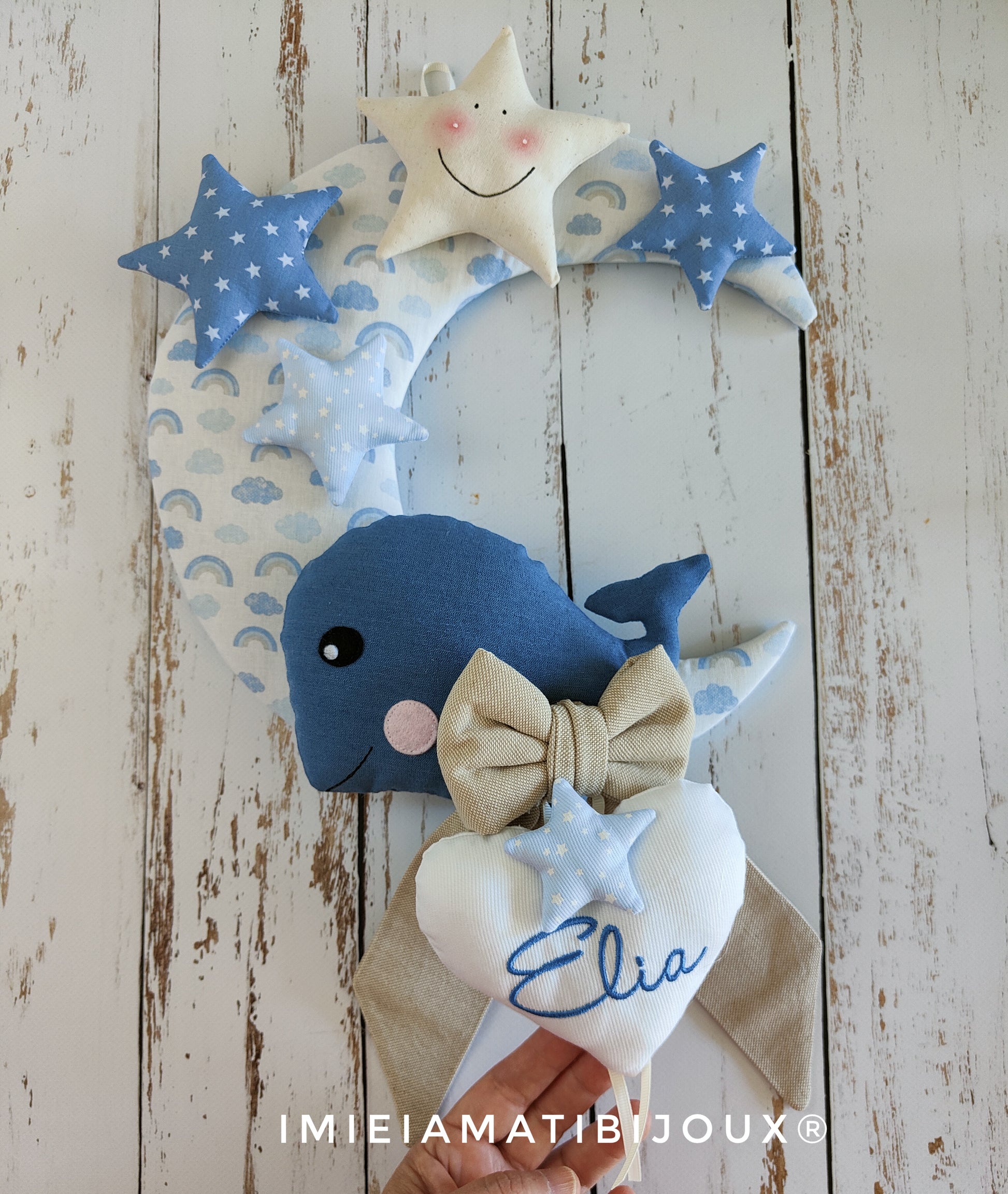 Un fiocco nascita composto da una luna dove sono appoggiati una balenottera e delle stelle. Il nome è ricamato su di un cuore. 30x45 cm circa. Da personalizzare col nome del vostro bimbo.